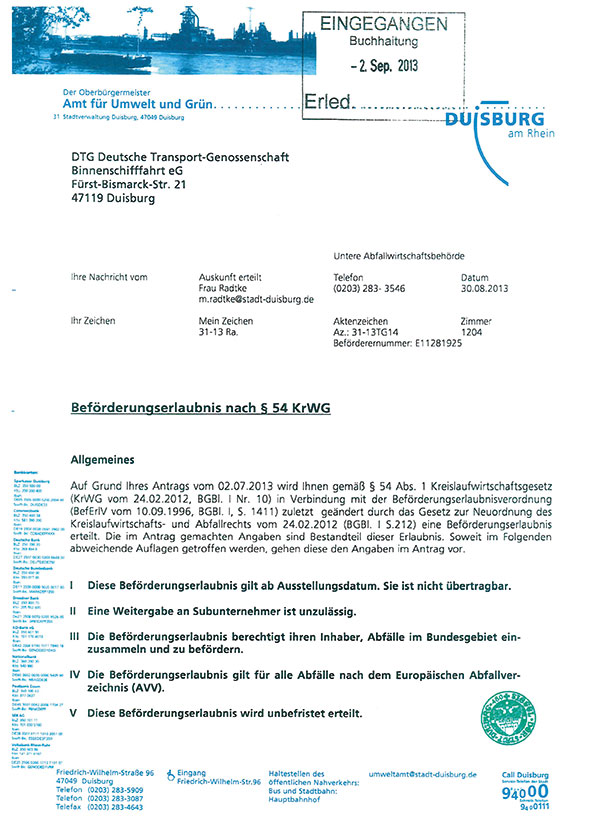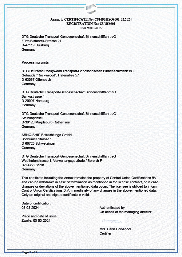 Today, DTG is represented in Germany with around 100 ships in the branch offices in Berlin, Hamburg, Magdeburg and Offenbach am Main. The cooperative is also represented internationally in Antwerp, Rotterdam and Szczecin, while its registered office is in Duisburg, the largest inland port in Europe. In this tightly meshed system of branches and representatives, the cooperative now employs more than 20 specialists with in-depth local knowledge, and who create and implement tailored solutions in the inland waterway transport regions.