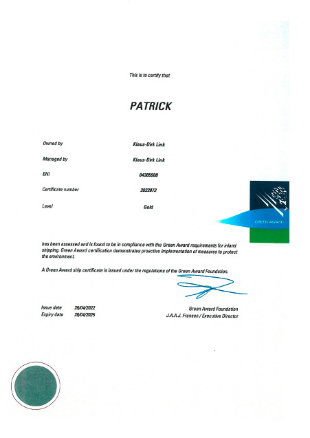 and his MS “Patrick” received the “Green Award in Gold” from the Green Award
